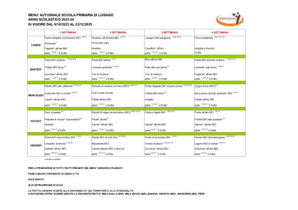 Si informano i genitori delle alunne e degli alunni della scuola Primaria di Luisago che da lunedì 6 ottobre 2025, entrerà in vigore il menù autunnale che partirà con la quarta settimana.